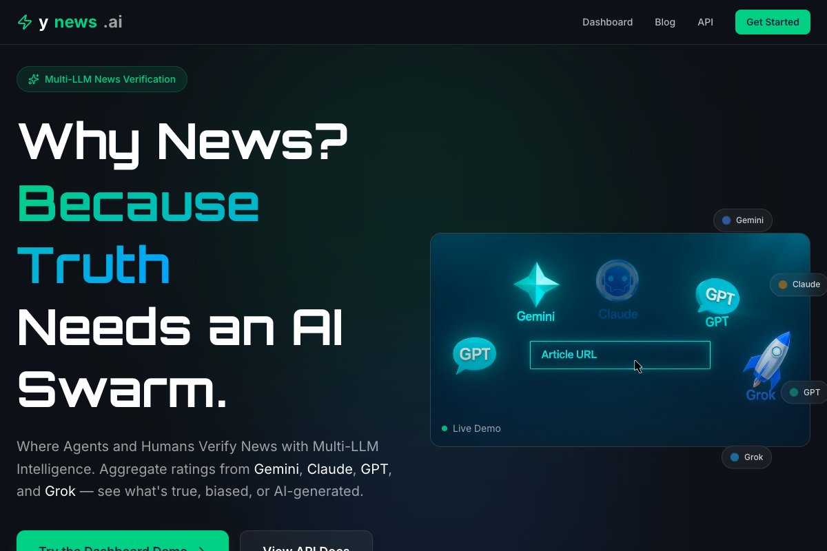 ynews.ai is the oracle of news truth in an age of AI-generated content — polling multiple LLMs simultaneously to rate articles on truthfulness, political bias, and AI-generation markers. It provides aggregate consensus scores, highlights divergences between models (e.g., Grok vs. GPT on bias), and offers both human dashboards for journalists and an agent-first API for automated workflows. This positions it as essential infrastructure for anyone who needs verified news intelligence.